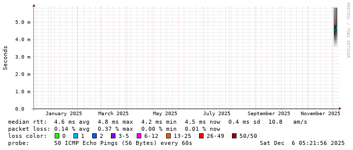 Global reference check (Cloudflare DNS). Provides a second external benchmark for Internet latency.
